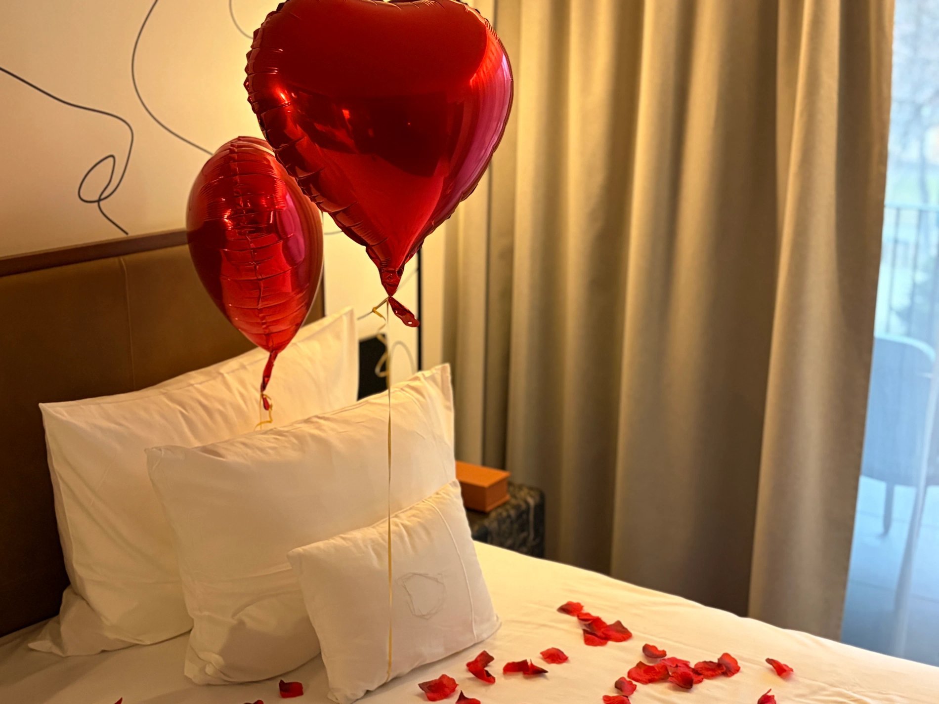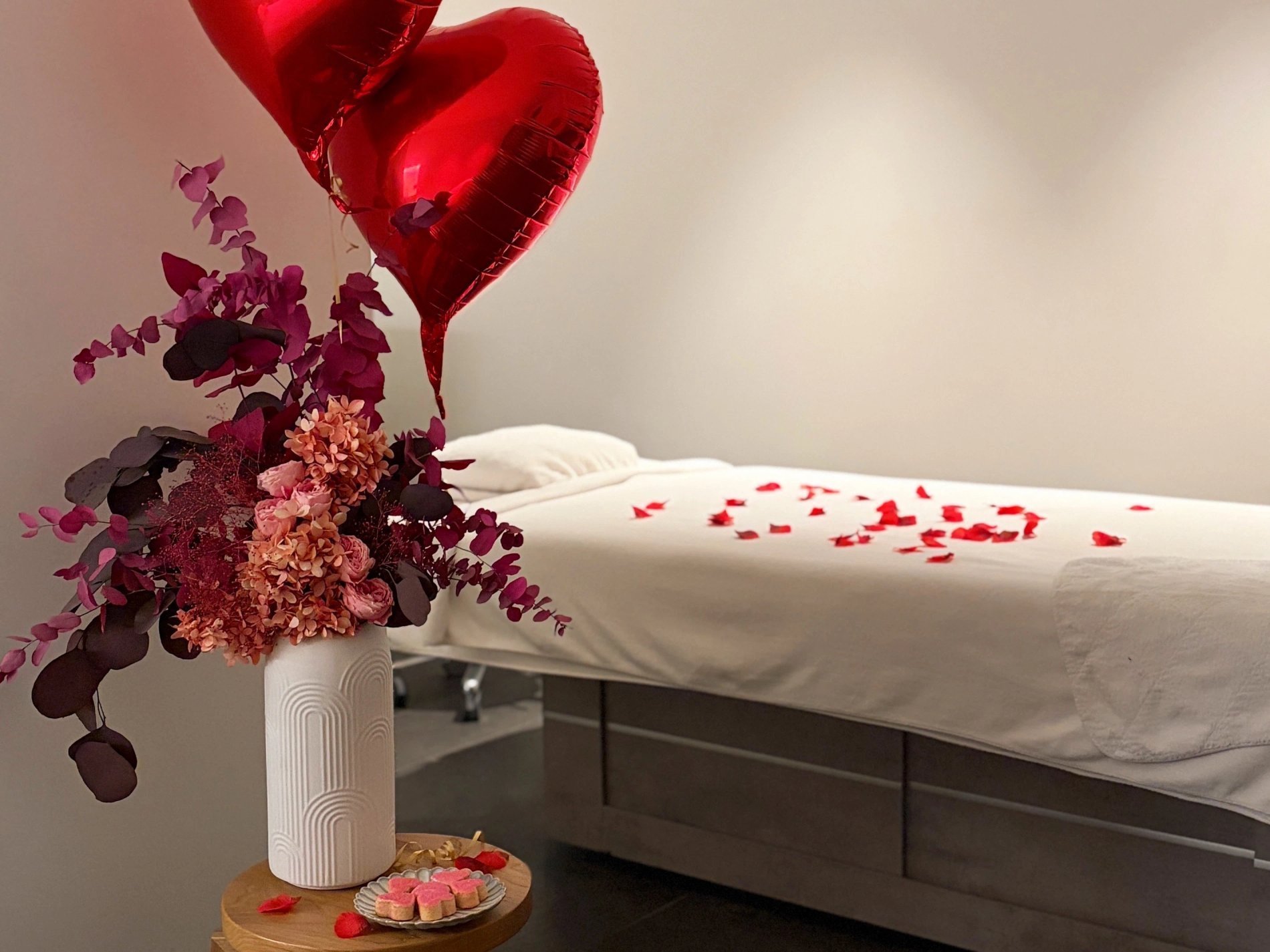 Surprenez votre moitié avec un accueil romantique en chambre : champagne, ballons coeur et pétales de rose.